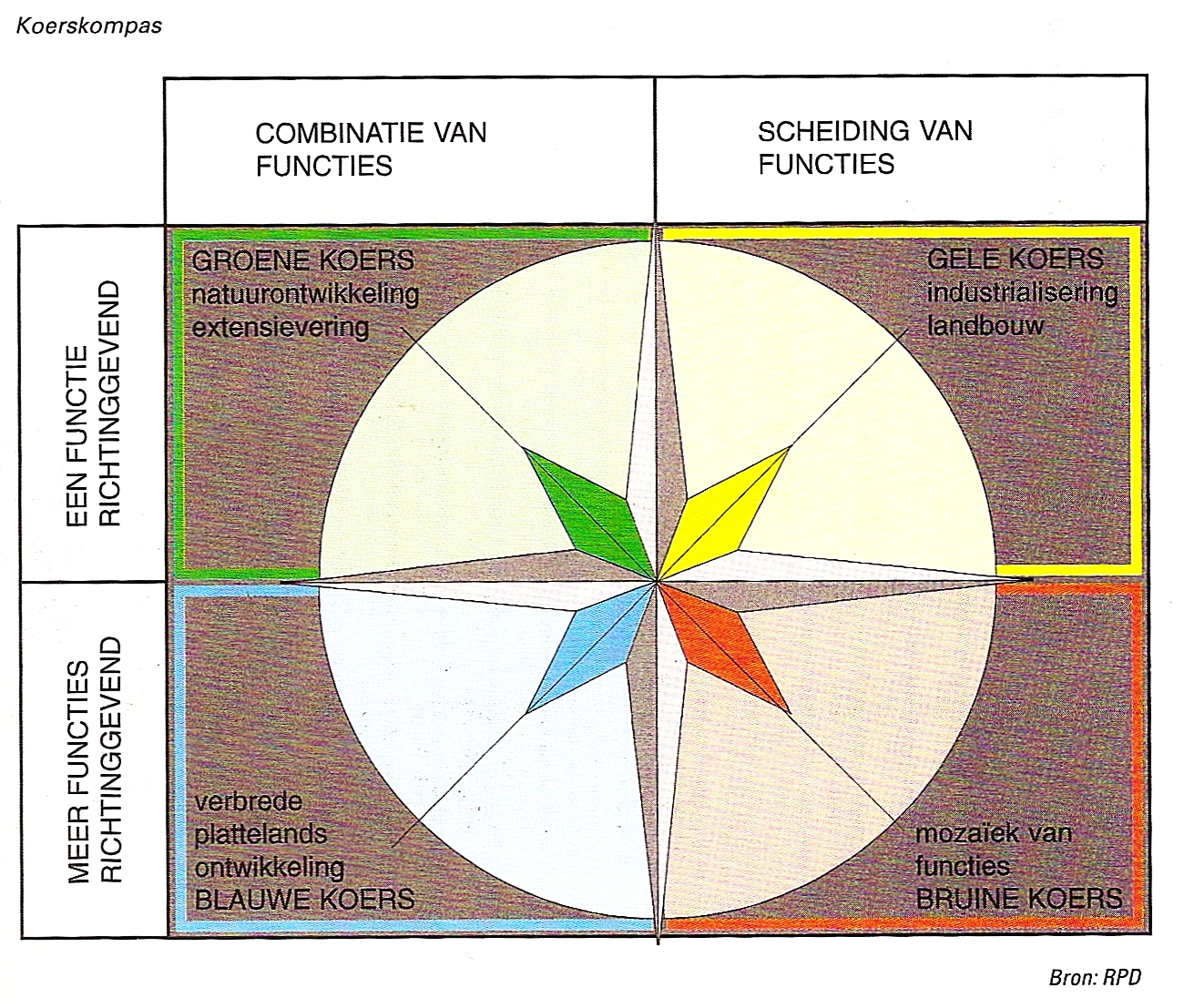 Na het verschijnen van de Vierde Nota heeft de beleidsontwikkeling voor het landelijk gebied zich in snel tempo voortgezet. Het Nationaal Milieubeleidsplan, de Structuurnota Landbouw, het Natuurbeleidsplan en de Derde Nota Waterhuishouding betekenden een heroriëntatie op gebruik en inrichting van de ruimte. Dit kreeg zijn neerslag in de vernieuwing van ruimtelijk beleid voor de landelijke gebieden in de Vierde Nota Extra. Dat was even hard werken want in een zeer korte tijd moest er nieuw beleid komen. In de eerste fase werd door een team externe deskundigen het rapport Multiplex opgesteld, in de tweede fase werd door medewerkers van de RPD daaraan een nadere onderbouwing en beleidsmatige uitwerking gegeven. Gekozen werd voor een indeling van het landelijk gebied in een viertal ontwikkelingsrichtingen: de 'koersen'.