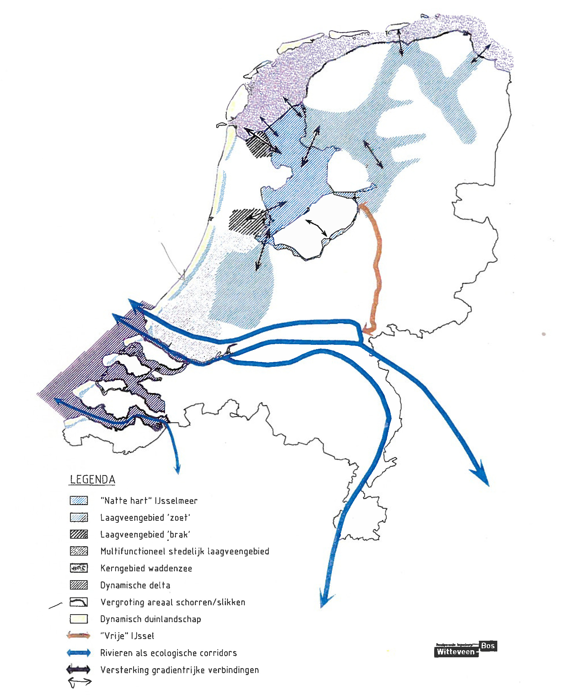 Het plan Ooievaar, de winnaar van de Eo Wijers prijsvraag in 1986, werd de basis voor een nieuwe generatie regionale plannen waarin het watersysteem en natuurontwikkeling als uitgangspunt genomen werd. In de negentiger jaren leek het er op dat we in aanvulling op de Ecologische Hoofdstructuur (EHS) nog veel meer ruimte konden maken voor de ontwikkeling van natte natuur. Inmiddels is duidelijk dat deze mogelijkheden beperkt zijn en nu alleen kans hebben in combinatie met maatregelen voor de veiligheid en tegen de wateroverlast.