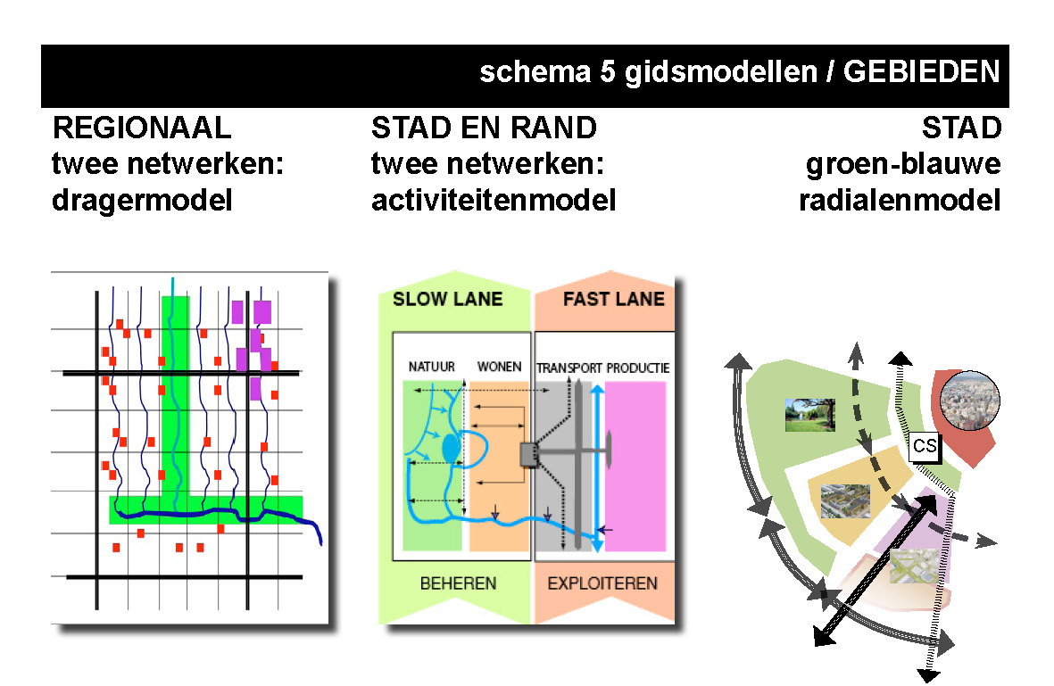 In een van de vingeroefeningen met deze strategie werd voorgesteld om in het bestaand stedelijk gebied te verdichten rond (de knooppunten) van het verkeersnetwerk en te verdunnen langs het waternetwerk.