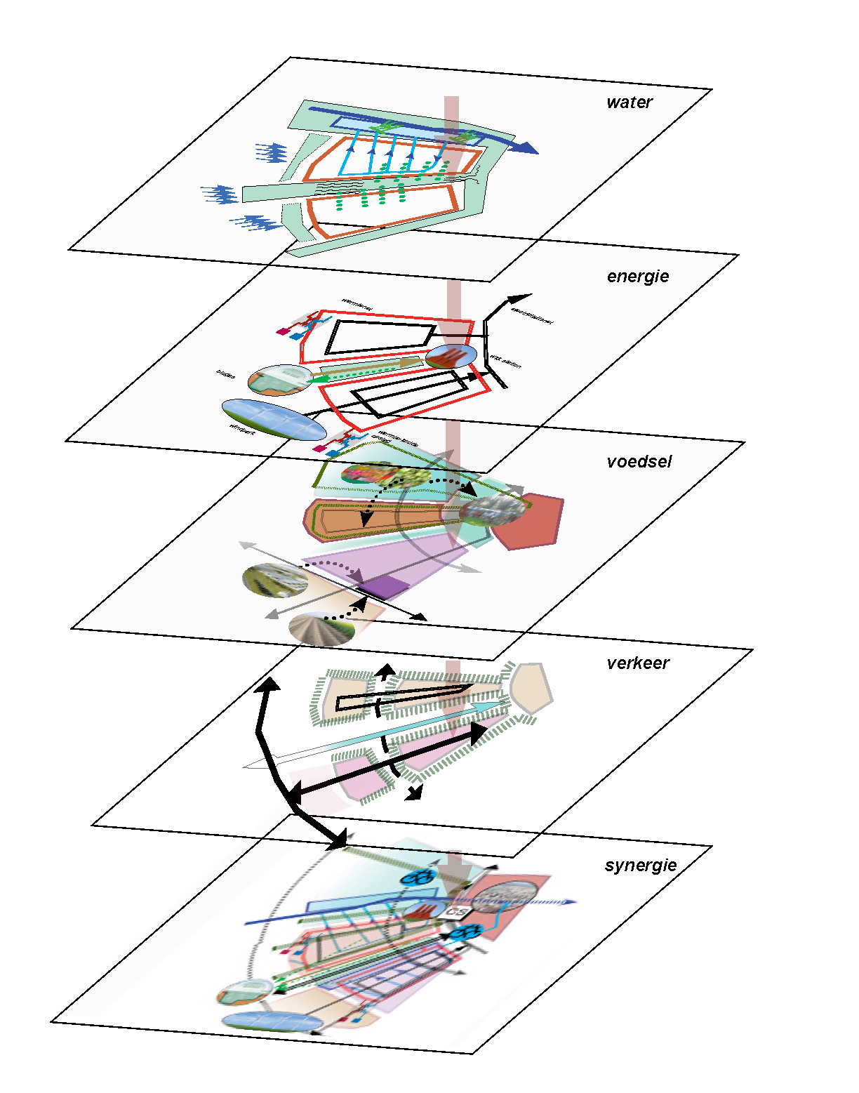 Op zoek naar synergie in het programma Nieuwbouw en Herstructurering is een op het stromenbeheer toegepaste benadering uitgewerkt. Voor water, energie, voedsel en verkeer zijn gidsmodellen uitgewerkt en vervolgens gestapeld.