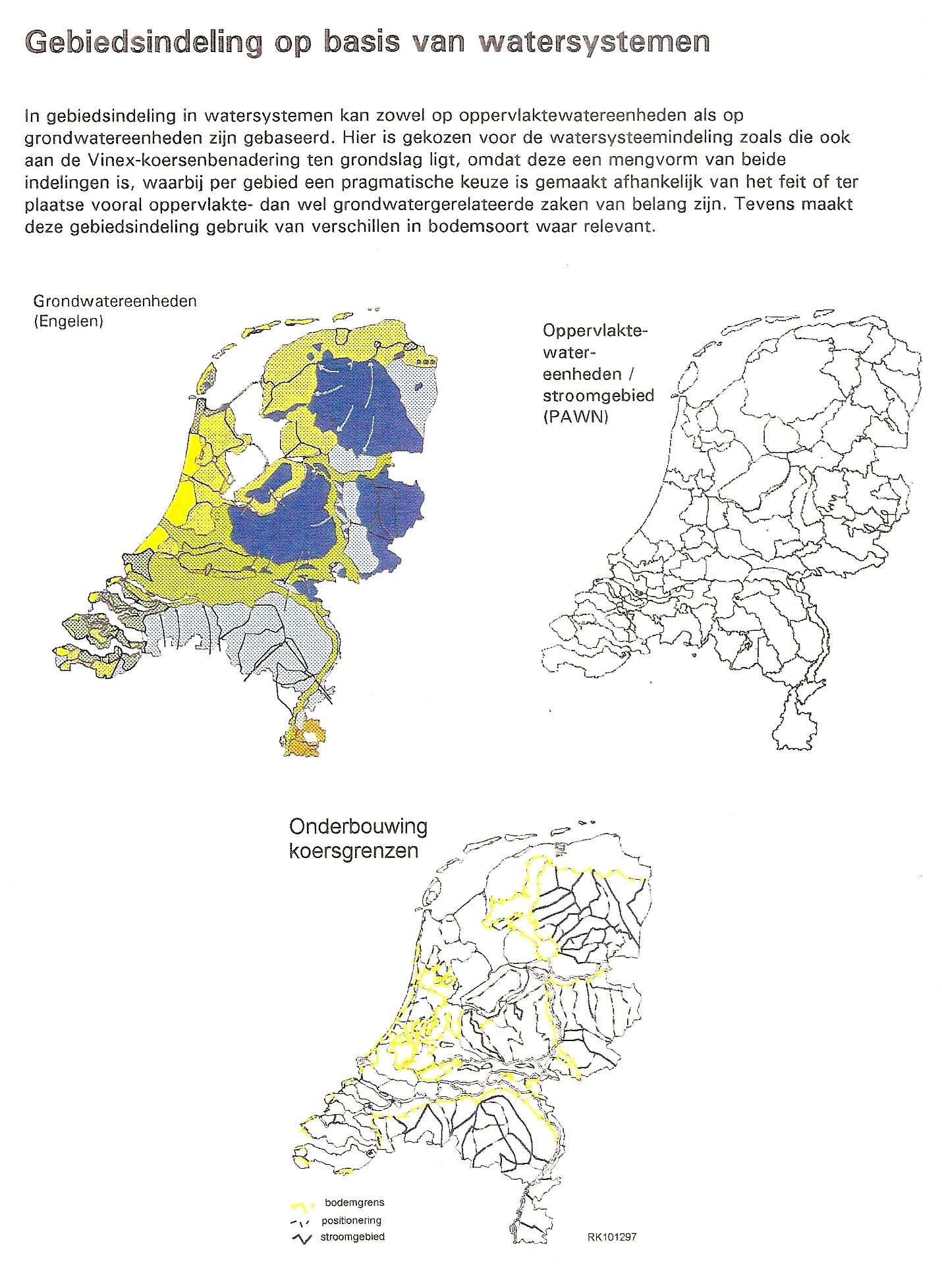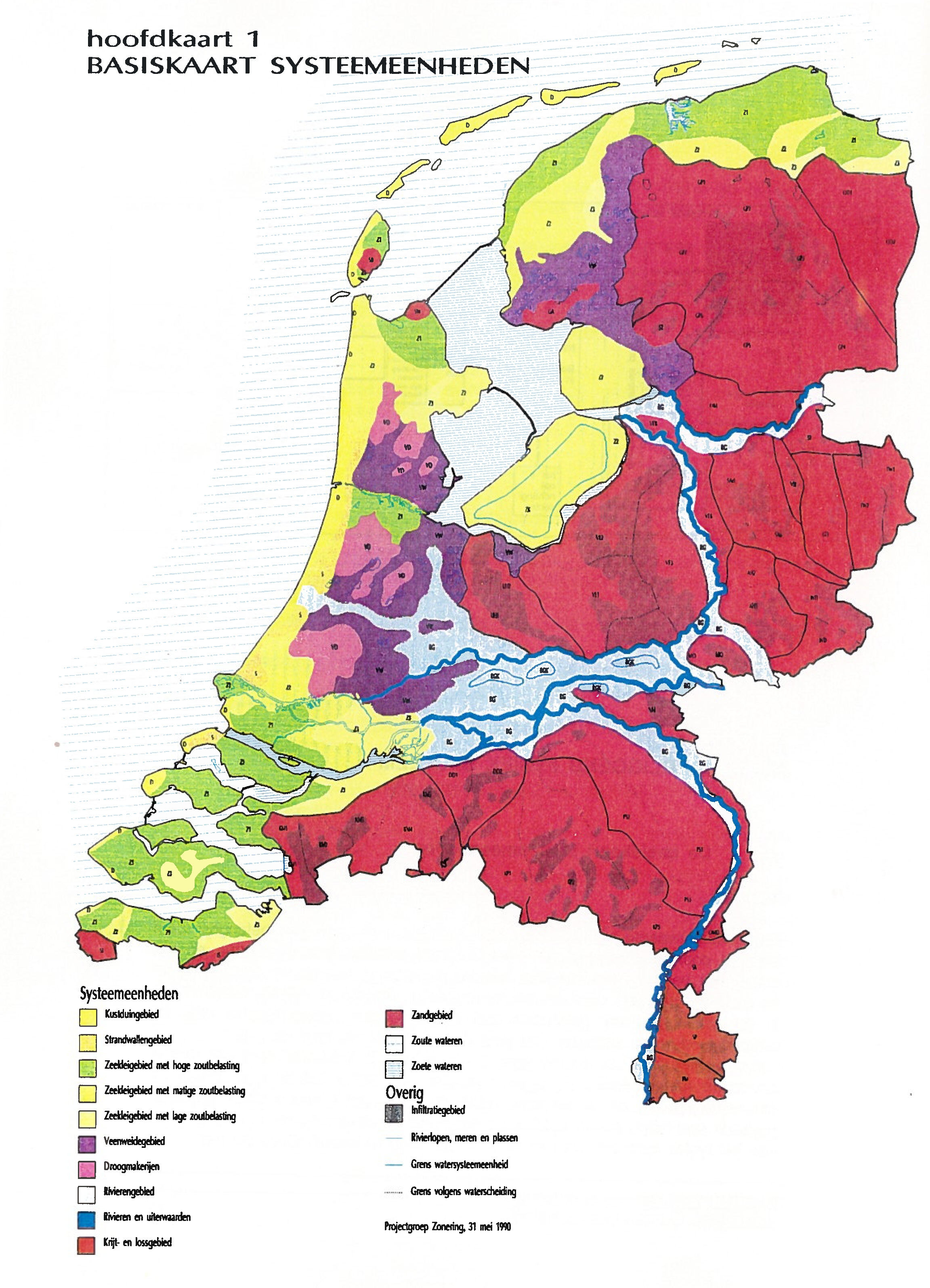 Er waren dus goede redenen om op basis van hydrologische samenhangen gebiedsgericht beleid te ontwikkelen. De basiskaart systeemeenheden leverde daarvoor de eerste indeling. De fysisch geografische landschappen werden ingedeeld op basis van informatie over grondwatersystemen en afwateringseenheden. De belangrijkste infiltratiegebieden worden ook op deze kaart aangegeven Deze kaart vormde de onderlegger voor de toekenning van de verschillende ontwikkelingsrichtingen (koersen). In latere studies werd dit getypeerd als de ‘deelstroomgebiedsbenadering’ : ervoor zorgen dat per watersysteemeenheid verenigbare ontwikkelingen plaatsvinden